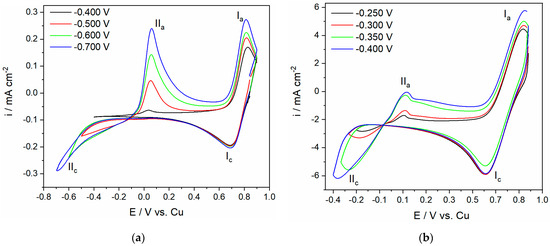 CVs on GC electrode starting from an initial Ei potential of 900 mV vs. Cu to different cathodic end potentials Ec in the ethaline (ChCl:EG (1:2) electrolyte): (a) 0.01 M Cu(II) and (b) 0.5 M Cu(II); T = 50 °C; scan rate 10 mV/s. Ec potentials are marked.