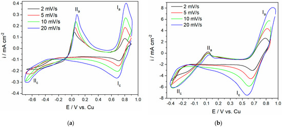 The voltammetry responses revealed that the increase in the Cu2+ concentration in the electrolyte led to a shift in the reduction potentials of the copper deposition to less negative electrode potentials. As a result, the onset of the Cu+ to Cu(0) reduction started at −450 mV vs. Cu when a concentration of 0.01 Cu(II)-ethaline was used, and at −150 mV vs. Cu when 0.5 M Cu(II)-ethaline was used. In related studies on the deposition and growth of Cu from ethaline, researchers have observed similar behavior, which is due to the different Cu+ concentration profiles near the electrode in these two solutions [14,15]. Figure 2 shows a set of experiments in which the impact of the potential scanning rate on the redox transition of copper was investigated. The CVs were recorded with scan rates gradually increasing from 2 to 20 mV/s on the GC electrode in an ethaline electrolyte with 0.01 M (Figure 2a) and 0.5 M (Figure 2b) Cu(II) concentrations at 50 °C. The scan was started at potentials slightly negative to the open circuit potential and swept to (a) –700 mV and (b) −400 mV vs. Cu for the 0.01 M and 0.5 M Cu(II)-ethaline, respectively. As seen in Figure 2, the reverse scan again shows considerable copper deposition over the potential range where copper dissolution is expected, continuing to around −90 mV vs. Cu in both electrolytes. Previous comparable experiments have investigated electrodeposition of Cu on a microdisk Pt electrode from aqueous perchloride solutions, 5 mM CuSO4 + 0.6 M HClO4 [26], and Cu electrodeposition from Cu(II)-ethaline [10,15]. A comparison of the results shown in Figure 1 and Figure 2 with similar results obtained in previous studies reveals the same electrochemical behavior of copper in this electrolyte [10,15].