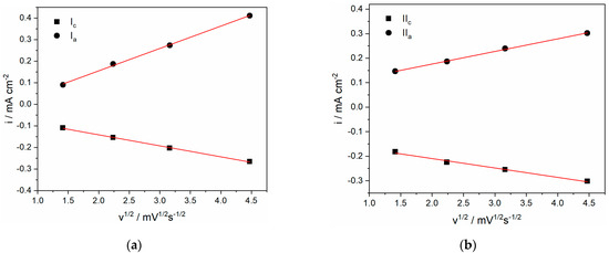 In addition, good linear relationships between the cathodic/anodic peak current densities (Ic/Ia and IIc/IIa) and the square root of the scan rate (ν1/2), as shown in Figure 3a,b respectively, were observed, where one exemplar measurement in 0.01 M electrolyte is presented for clarity. These results suggest that the reduction processes of Cu2+ and Cu+ in ethaline electrolytes are predominantly diffusion-controlled in the 0.01 M electrolyte. However, it should be noted that the plots of Ic versus ν1/2 in the 0.01 M electrolyte do not pass through the origin, indicating that the decomplexation of the copper ions has to occur during Cu2+ → Cu+, and the Cu+ → Cu(0) reduction and cannot be neglected [13,15]. The non-zero intercept in the linear plot could be assigned partially to the significant effect of uncompensated electrolyte resistance and/or adsorption phenomena, which are often a feature of choline chloride-based electrolytes [8,15,16]. To some extent, different behavior was observed for the 0.5 M electrolyte. In this case, good linear relationships between the cathodic peak current densities (Ic/IIc) and the square root of the scan rate (ν1/2) applied were also observed, but the deviation from zero intercept was higher than for 0.01 M Cu(II)-ethaline.