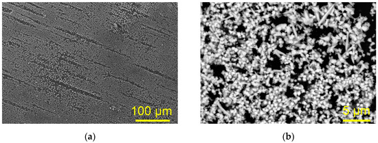 It can be seen from Figure 4a that a uniform Cu film was not formed through electrodeposition at the given potential. Analysis of the electrodeposit at higher magnification (Figure 4b) showed that relatively irregular Cu grains, sized up to 1 μm, were dominantly formed by the electrodeposition from this electrolyte. Carrot-like or the needle-like dendrites with lengths of up to 5 μm were also formed, but to a lesser extent than the grains.