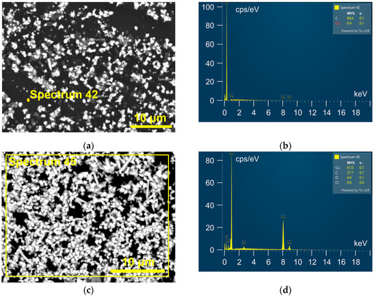 EDS analysis of Cu deposit obtained via electrodeposition from 0.01 M Cu(II)-ethaline electrolyte at a cathodic potential of −700 mV vs. Cu on the GC cathode. (a,b) The point analysis, (c,d) the whole surface analysis.