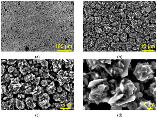 The morphology of Cu deposit obtained via electrodeposition from 0.5 M Cu(II)-ethaline electrolyte at a cathodic potential of −400 mV vs. Cu on the GC cathode. Magnification: (a) ×250, (b) ×2000, (c) ×3500, (d) ×10,000.