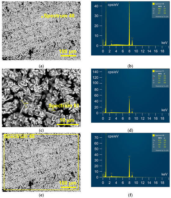 EDS analysis of Cu deposit obtained via electrodeposition from 0.5 M Cu(II)-ethaline at a cathodic potential of −400 mV vs. Cu on the GC cathode. (a–d) The point analysis, (e,f) the whole surface analysis.