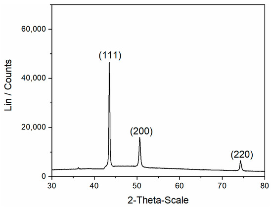 Further insight into the structure of the electrolytically produced Cu was obtained via XRD analysis of the rose-like forms removed from the GC electrode after the completed electrodeposition process. Figure 8 shows the diffractogram of the rose-shaped particles obtained via the electrodeposition at a cathodic potential of −400 mV vs. Cu from 0.5 M Cu(II)-ethaline.