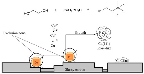 The electrodeposition process consists of nucleation and growth. The final morphology of the electrodeposited metal is determined in a growth process, and it is dependent of the type of electrodeposition control. It is clear that the morphologies of the Cu deposits obtained with concentrations of Cu(II) ions of 0.01 M and 0.5 M more likely indicate the influence of diffusion control on their formation. Nuclei formed in the initial stage of electrodeposition represent microelectrodes situated deep inside the diffusion layer of the macroelectrode. The spherical diffusion fields are formed around initially formed nuclei, causing faster growth of their tips than other parts of the surface [23]. As a final result of the growth process, different disperse (irregular) forms, such as the needle-like or the carrot-like dendrites (Figure 4) and the rose-like forms (Figure 6), are formed as the final surface morphologies. The electrochemical reduction of Cu(II) ions in ethaline and the morphology of the Cu deposit considered in this study are summarized in Figure 9.