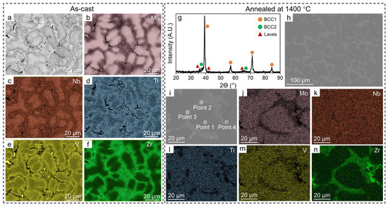 Microstructure and elemental distribution of as-cast and annealed MoNbTiVZr RHEA. (a) BSE image and (b–f) EDS maps of the as-cast alloy. (g) XRD pattern, (h,i) BSE images, and (j–n) EDS maps of the annealed alloy.