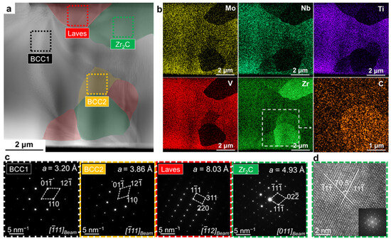TEM characterization of the MoNbTiVZr RHEA: (a) high-angle annular dark field (HAADF) image; (b) EDS mapping; (c) SAED pattern corresponding to the regions marked by rectangles in (a), with superstructure reflections in the FCC phase highlighted by red circles; (d) high-resolution TEM image of the Zr2C phase along the [011] zone axis.