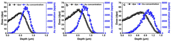 SRIM-calculated displacement damage and Au-ion implantation profiles for 6 MeV Au irradiation at 1 × 1016 ions/cm2 in (a) BCC1, (b) BCC2, and (c) Zr2C phases of the MoNbTiVZr RHEA.