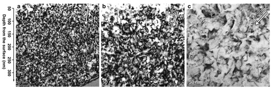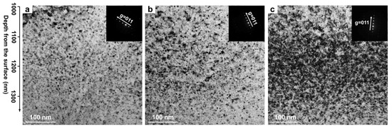 Morphology of irradiation-induced defects at the peak damage region in the BCC1 phase after irradiation to (a) 2 × 1015 ions/cm2, (b) 4 × 1015 ions/cm2, and (c) 1 × 1016 ions/cm2.
