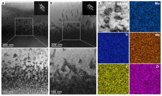 Figure 5 showed the morphology of irradiation-induced defects in the BCC1 phase at different fluences. Notably, perforations were observed beneath the Pt protective layer, resulting from the complete etching of the relatively thin upper region during electropolishing. However, these perforated FIB specimens remained suitable for analysis, as the defect characterization in the peak damage region was unaffected. All defects were observed under a kinematical bright-field condition using g = 011 close to [001] or [01] zone axis. The peak damage region exhibited exclusively high-density nanoscale dislocation loops (about 10 nm diameter), with no detectable voids or precipitates. At the fluence of 2 × 1015 ions/cm2, the dislocation loops were very small and observed as black spots, confirming the low mobility. As the fluences increased from 2 × 1015 to 1 × 1016 ions/cm2, the change in the size of the dislocation loops was not remarkable, but the density increased significantly. Although direct observation of BCC2 phase damage at 2 × 1015 ions/cm2 was precluded by FIB sampling limitations, fluence-dependent evolution was evident: dislocation clusters nucleated in shallow regions and gathered within the peak damage zone (Figure 6a,b). TEM-EDS confirmed these clusters comprised pure dislocation aggregates without elemental segregation (Figure 6c).