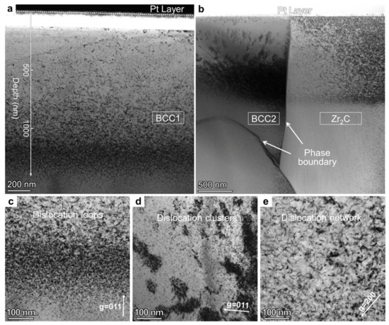 TEM images of different phases in the MoNbTiVZr RHEA after irradiation at 1 × 1016 ions/cm2. (a,b) Cross-sectional views of damage layers. Irradiation-introduced dislocation defects of peak damage region for (c) BCC1, (d) BCC2, and (e) Zr2C phases.