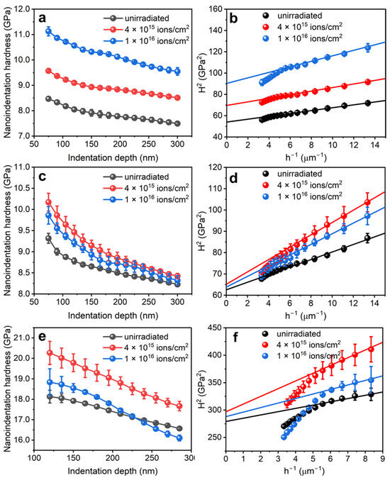 Figure 10 presented the nanoindentation hardness of individual phases in the MoNbTiVZr RHEA before and after irradiation at different fluences. The indentation size effect was corrected using the Nix–Gao model [41], with summarized hardness data, incremental changes, and hardening rates provided in Table 4. It should be noted that the actual plastic deformation depth during nanoindentation typically extends up to ~10 times the indentation depth [42]. Meanwhile, the irradiated damage layer exhibits a non-uniform defect density distribution along the depth, which inevitably influences hardness measurements at different penetration depths [43,44,45]. Accordingly, in the Nix–Gao plot, the fitting was primarily performed on hardness values corresponding to the peak damage region, where the indentation depth h ranged approximately from 100 to 140 nm (i.e., h−1 between 7 and 10 μm−1). This approach guarantees that the analyzed deformation zone lies entirely within the peak damage region (1000~1400 nm in depth), as demonstrated in Figure 5. Before irradiation, the average hardnesses of the BCC1 and BCC2 phases were 7.35 and 7.86 GPa, respectively, while the Zr2C phase showed a much higher hardness of about 16.71 GPa. This extremely high intrinsic hardness originates from carbon-induced lattice distortion and strong covalent Zr-C bonding [46]. Post-irradiation hardening occurred universally across all phases, with distinct trends: BCC1 exhibited monotonic hardening, while BCC2 and Zr2C displayed initial hardening followed by softening at 1 × 1016 ions/cm2. Both the maximum hardness increment (2.13 GPa) and hardening rate (29.0%) was found in the BCC1 phase at 1× 1016 ions/cm2.
