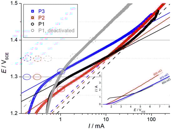 Figure 1 presents the OER polarization characteristics of the anode at different surface positions, which are based on the data reported in the previous paper [19], with additional data extended up to overpotentials relevant for OEA operation and electrolytic stability testing (inset of Figure 1). The main feature of the polarization at low to moderate overpotentials—the switch of the Tafel slope to its near doubled value—is analyzed here by fixing the ohmic drop correction of the polarization data to the value that produces the slope of 120 mV at the anodic potentials > 1.42 V; in the previous paper [19], it was performed arbitrarily, and the corresponding Tafel slope ranged from 99 to 127 mV. For an illustration, the polarization data at position P1 are given for its deactivated state upon electrolytic stability testing by an accelerated stability test (AST) as well; the other two positions, P2 and P3, show similar features in their deactivated state [19]. The present approach to polarization data aims to consider the possibility that the unique Tafel slope in the deactivated state corresponds to the slope found for the active (as-prepared) state at higher overpotentials, and both stand near 120 mV. The doubling of the slope in an active state with respect to a low overpotential region was commented on in the previous paper by considering the contribution of the porous structure of the anode coating. The analysis was based on the electrochemical responses at the open circuit potential to prove their apparent relationship to OER activity. For this analysis to be posed as a rule, it should also fit to the electrochemical properties at the potentials at which the OER takes part. This involves the consideration of the following two kinetic issues: (i) the switch of the rate-determining step in the OER mechanism, which is proposed as the cause of the switch of the slope [27]: the r-d step switch is usually from dissociative adsorption with charge transfer at low overpotentials to the recombination of intermediates at high overpotentials ( it should be noted that there is no clear consensus about the complicated 4-electron OER mechanism); (ii) the onset of pH-dependent electrochemical dissolution of Ir species, which is found to take part in parallel to the considerable rate and exchanged mechanism as well, at the potentials above ca. 1.6 VSCE [28,29,30]. The kinetics of Ir dissolution, which were the cause of anode deactivation, were found dependent on the state of Ir oxide [31], whereas the slope of the electrochemical dissolution of noble metal oxides in general was reported to be close to 120 mV and to share intermediates with OER [29,30,31,32,33]. It follows that the slope at high overpotentials should be considered as the interplay value of the two processes in parallel—OER and Ir dissolution—although the latter is of an appreciable lower rate.