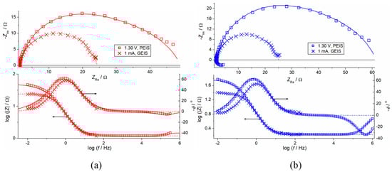 Registered differences in active and deactivated states between P2 and P3 appear to not substantially affect the mechanism of the loss of anode activity, but they are useful to elucidate the apparently tiny differences between their OER activities. Indeed, the circuit parameters related to the deactivated state, Rp and Cp, are quite similar for P2 and P3, and they show the dependence on the regime. Rp is higher in the GEIS regime and coincides with the values found at OCP [19]. The important finding is that the parameters of the defined coating layer of the lost activity apparently depend on the current/potential operational conditions, which should not be the case if it is newly generated as insulating. To check the behavior of key impedance parameters from Figure 5 and Figure 6 in the deactivated state, the deactivated position P1 is checked by PEIS and GEIS under different conditions. The results are shown as AST data in Figure 7.