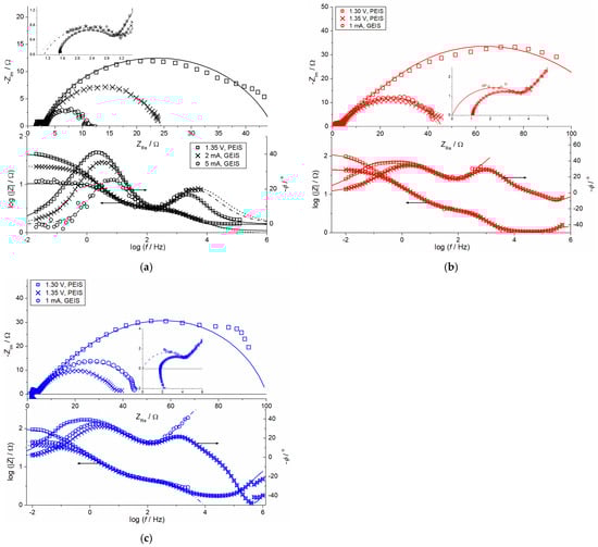 To further analyze these suppositions, impedance measurements are performed in the potential region of OER. The activity response is checked by performing potentiostatic (PEIS) and galvanostatic (GEIS) measurements on active and deactivated states of anode surface positions at characteristic polarization points indicated by ellipses in Figure 1. Figure 2 presents the data of the most and the least active positions P2 and P3, whereas Figure 3 relates to a deactivated state of all positions. The insets in Figure 3 show the high-frequency features of complex plane plots related to the anode deactivated state. The appearance of the loops in complex planes reflects into Bode phase angle peaks at distinct frequencies. While PEIS loops show the apparent complex overlapping structure, GEIS loops appear much like semicircle dependencies. For both PEIS and GEIS responses, however, the extension of a simple circuit of capacitance and resistance in parallel was required to fit the impedance data and to reach the parameters of anode OER behavior. The equivalent electrical circuits are shown in Figure 4, whereas the circuit impedance responses are given in Figure 2 and Figure 3 by full or dashed lines. The inductive characteristics were observed in the high frequency region of PEIS measurements (shown for P3 as an illustration in Figure 3) and are not discussed since no significant dependence of the inductance on the surface position and potential were found. The circuits for GEIS responses are the same, with inductive elements excluded.