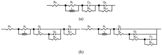 Equivalent electrical circuits used to fit the PEIS impedance response of the anode in its active (a) and deactivated states (b); for GEIS, the inductive RIL part is omitted.