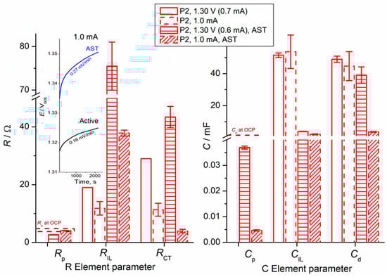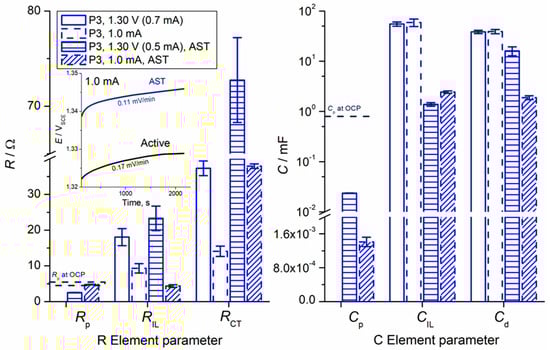 Figure 5, Figure 6 and Figure 7 show the values, with corresponding absolute fitting errors as y-bars, of the circuit parameters at different surface positions. From Figure 5 and Figure 6, the parameters for P2 and P3, respectively, can be compared. In the active state (the data for the deactivated state are marked with “AST”), the RCT from PEIS is higher than RIL and is also higher for initially less active P3 in comparison to P2. While RIL and RCT from GEIS (which are lower values from PEIS for both P2 and P3 positions due to higher current) for more active P2 are similar (and even a bit lower RCT is obtained, contrary to PEIS data), higher RCT is found for P3 from the PEIS data. Bearing in mind that RCT from PEIS is higher for P3, it can be concluded that the initially lower OER activity of P3 is reflected in mentioned trends of circuit resistivity parameters, despite the fact that the data were collected upon prolonged polarization with decreasing activity. The cause of the initial differences in activity is also seen from potential decays given as the insets of Figure 5, Figure 6 and Figure 7. Although the linearized parts of decay for both P2 and P3 are of similar slope, the initial value of potential is lower, and its initial decay (up to 500 s) is much higher for P2, which should lead toward the equalization of activity upon prolonged polarization.