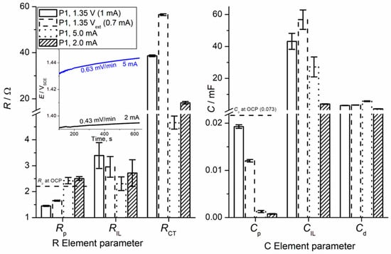 Since galvanostatic loss of the activity is much steeper (inset of Figure 7) than for positions P2 and P3, the changes of the parameters were also checked upon extended polarization at 1.35 V (1.35 Vext data). The average current is lower (0.7 mA in comparison to 1.0 mA as the initial value), and only RCT is increased, which indicates that the stationary loss of activity mainly concerns OER. To some small degree, the Rp is also increased, which appears as a rule for Rp to increase with prolonged and intensified polarization (Rp grows with the increase in current from 1 to 5 mA). On the other hand, Cp considerably decreases for an order of magnitude. It appears that the parameters of the deactivated surface coating layer are sensitive to the products of the charge transfer processes that take place in the coating interior, although it does not participate due to the exhausted active Ir component.