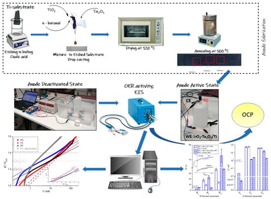 A schematic of the experimental approach applied in the present and previous study is shown [19]. The segment “Anode fabrication” gives the steps related to Ti substrate preparation, coating precursor application by drop casting, and coating formation by dried layer calcinations. The appearance of an etched and coated sample is also presented with corresponding steps. In the lower segment, the coating performance analysis under faradaic and non-faradaic conditions (the latter applied in the previous study [19]) in characteristic electrochemical cell set-up is presented. The same cell set-up is used for non-faradaic, faradaic, and deactivation experiments. WE is positioned horizontally at the bottom of the cell to allow free gravitational exhaustion of evolving oxygen from the anode surface.