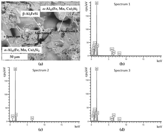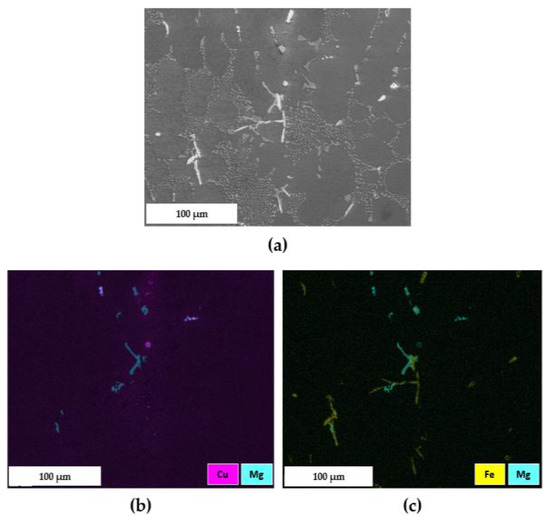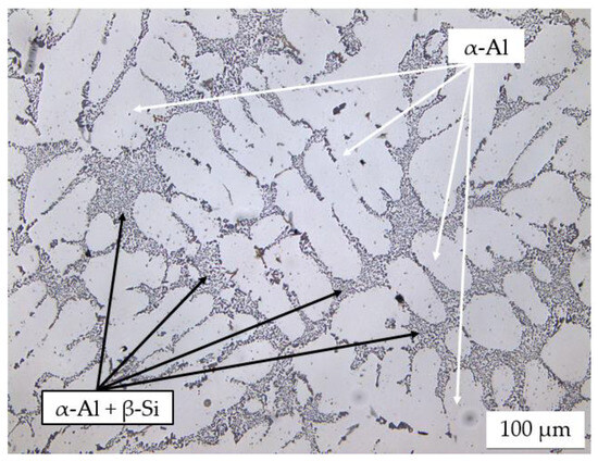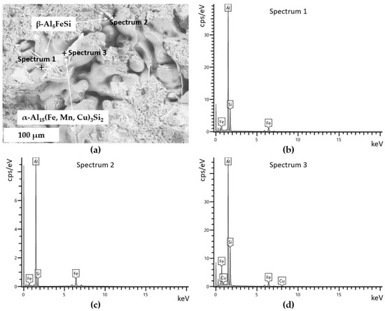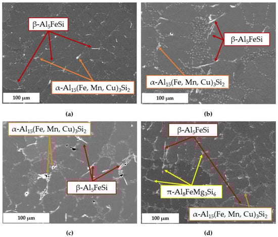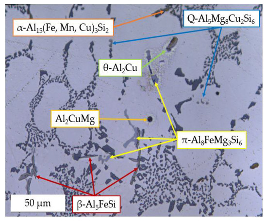 - Concerning the solidification sequence of the examined alloy, thermal analysis proved the formation of the primary α-Al phase, the α-Al + β-Si eutectic structure, the Fe-rich β-Al5FeSi and α-Al15(Fe, Mn, Cu)3Si2 intermetallics, the π-Al8FeMg3Si6 and β-Mg2Si precipitates, and the low-melting post-eutectic θ-Al2Cu and Q-Al5Mg8Cu2Si6 phases. Except for the β-Mg2Si, the presence of these phases within the as-cast microstructure was also confirmed by light and scanning electron microscopy.