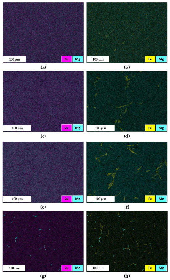 - The EDS maps proved that the ST4 treatment, carried out at 510 °C for 2 h, caused only a partial dissolution of the π-Al8FeMg3Si6 phase into the α-Al matrix. Nevertheless, the strengthening effect was guaranteed by the dissolution of (Mg2Si), (Al2Cu) or (Al5Mg8Cu2Si6) intermetallic phases, thus to the synergic effect of Mg and Cu in the subsequent precipitation hardening during AA.