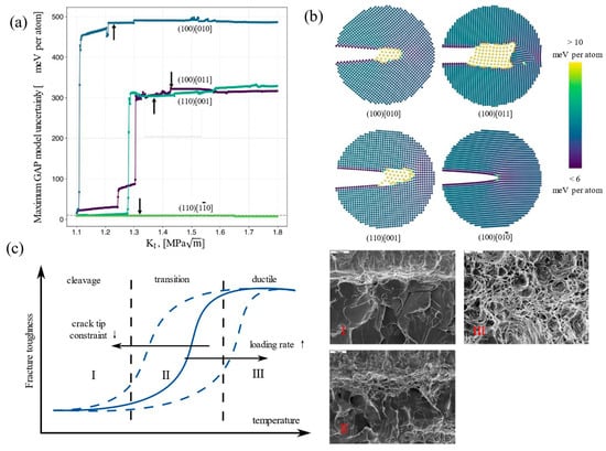 Figure 1. Fracture predictions of Fe-GAP18 (an existing Gaussian approximation potential for ferromagnetic BCC iron) trained on Dragoni et al.’s original database (Reprinted from Ref. [29]) and fracture toughness in the DBT region (Reprinted from Ref. [30]). (a) Maximum model uncertainty during fracture simulations of four crack systems; (b) simulation snapshots colored by the model’s uncertainty; (c) fracture toughness in the DBT region.