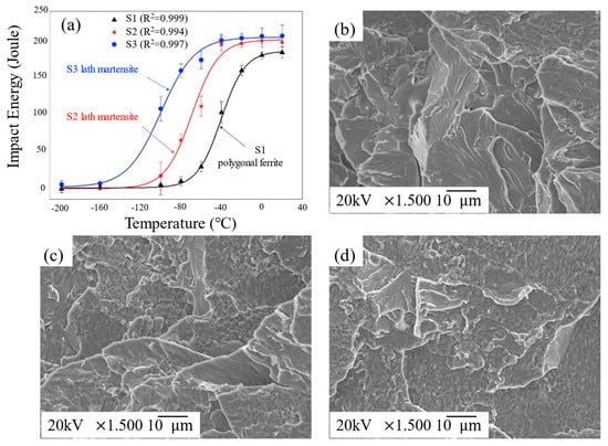 Figure 2. (a) The impact energy vs. test temperatures along with the Boltzmann function fitting based on the experimental data (Reprinted with permission from Ref. [32], 2019, Elsevier). Typical impact fracture surfaces of steels fractured at −40 °C for (b) S1 (the rolled sample was austenitized at 900 °C for 0.5 h, followed by water quenching), (c) S2 (the other homogenization-treated ingot was forged to 55 mm thickness; the as-forged sample was rolled at 1000 °C down to 12 mm in thickness and water-quenched), and (d) S3 (the S2 steel was austenitized at 900 °C for 0.5 h, followed by water quenching).