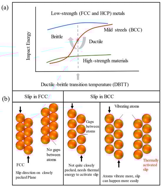 Figure 3. (a) Schematic diagram of the ductile and brittle behavior of three crystalline structures of metals or alloys (Adapted from Ref. [33]). (b) Comparison of BCC and FCC metal slip systems (https://msestudent.com/what-is-the-difference-between-fcc-and-bcc-crystal-structure-properties-interstitial-sites-and-examples, accessed on 24 January 2020).