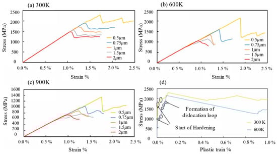 Figure 4. Stress–strain curves at different sizes for (a) 300 K, (b) 600 K, and (c) 900 K. (d) Stress vs. plastic strain for 0.5 μm at 300 K and 600 K (Reprinted with permission from Ref. [38], 2023, Elsevier).