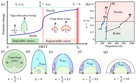 Figure 5. Mechanism of the relative mobility of the screw versus edge dislocations controlling the DBT in metals (Reprinted from Ref. [8]. and Reprinted with permission from Ref. [10], 2025, Elsevier). (a) The relative mobility of dislocations determines the efficiency of the dislocation source (TC—critical temperature; ve—edge dislocation velocity; αDBT—the α value at DBTT; α—velocity ratio of screw dislocation and edge dislocation; t0—time before dislocation bow-out; t1—time after dislocation bow-out); (b) the relative mobility of screw versus edge dislocations with temperature for Cr, Al, W, and Fe; (c) efficient operating F-R dislocation source with α = 1; (d) disposal dislocation source with α = 0; (e) dislocation source with lower efficiency (α < 0.5); (f) dislocation source with an efficiency of α = 0.5; (g) dislocation source with higher efficiency (α > 0.5).