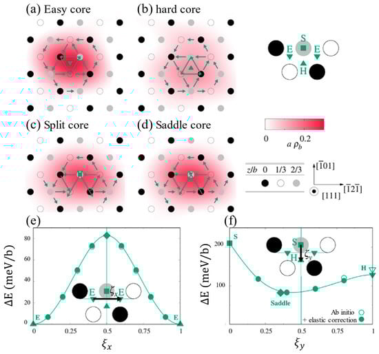 53. Vitek, V. Core structure of screw dislocations in body-centred cubic metals: Relation to symmetry and interatomic bonding. Philos. Mag. 2004, 84, 415–428. [Google Scholar] [CrossRef]
