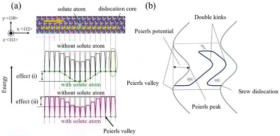 Figure 7. (a) Schematic diagram of the influence of solute atoms on the screw dislocation slip energy barrier (Reprinted with permission from Ref. [16], 2017, Elsevier). (b) Schematic diagram of double kinks.
