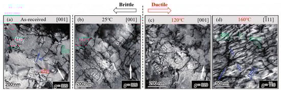 Figure 8. Evolution of dislocation structures in rolled tungsten before and after DBT (Reprinted with permission from Ref. [49], 2021, Elsevier). (b—Burgers vector). (a) Pre-existing dislocations before testing, (b) below the DBTT, (c) at the DBTT, and (d) above the DBTT.