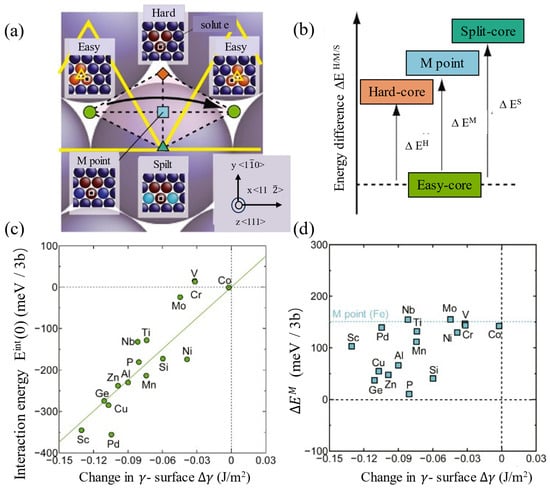 Figure 10. The schematic of the effects of a solute atom on the energy surfaces for screw dislocation slip motion (Reprinted with permission from Ref [16], 2017, Elsevier). (a) Transformation of the dislocation core structure during the slip process; (b) energy differences in dislocation core structures; (c) the values of Eint(0) are plotted as functions of the change in the γ-surface ∆γ in the panels; (d) the values of ∆EM are also plotted as functions of the change in the γ-surface ∆γ in the panels.