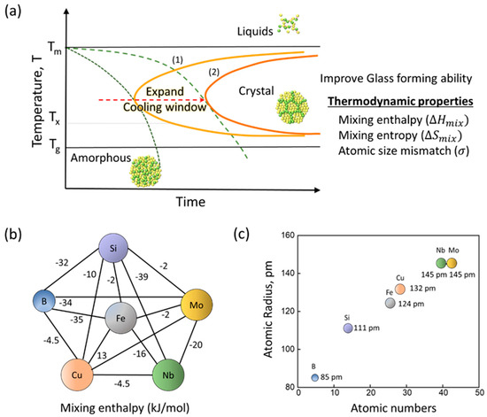 (a) Schematic of time–temperature–transformation (TTT) diagram for the crystallization of a glass-forming liquid, illustrating the significance of the expanded cooling window on enhancing glass-forming ability (GFA); (b) iIllustration of the mixing enthalpy, showing the thermodynamic interactions between elements; (c) comparison of the atomic radius in the alloy system.