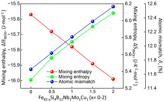 Mixing enthalpy (), mixing entropy (), and atomic mismatch () of Fe82−xSi4B12Nb1MoxCu1 (x = 0–2) melt-spun ribbons.
