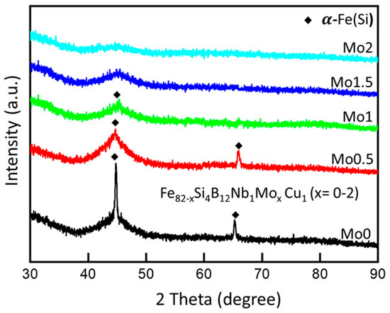 To verify the effects of thermodynamic factors, XRD analysis was performed on the fabricated Fe82−xSi4B12Nb1MoxCu1 (x = 0–2). The XRD results, shown in Figure 3, revealed that increasing the Mo content enhanced the stability of the amorphous phase. In the Mo0-Mo1 ribbons, peaks corresponding to α-Fe(Si) were observed, with surface crystallization peaks of α-Fe(Si) at 2θ ≈ 65° appearing in Mo0 and Mo0.5 ribbons. This indicates that surface crystallization occurred during ribbon fabrication, deteriorating the soft magnetic properties. In contrast, the Mo1.5 and Mo2 ribbons exhibited stable amorphous phases with halo patterns, emphasizing the effect of Mo addition in stabilizing the amorphous phase and enhancing the soft magnetic properties.
