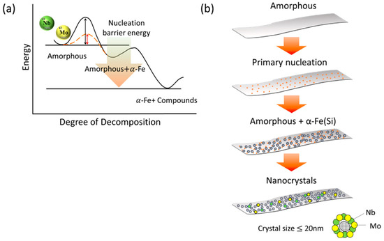 - Ayers, J.D.; Harris, V.G.; Sprague, J.A.; Elam, W.T.; Jones, H. On the formation of nanocrystals in the soft magnetic alloy Fe73.5Nb3Cu1Si13.5B9. Acta Mater. 1998, 46, 1861–1874. [Google Scholar] [CrossRef]