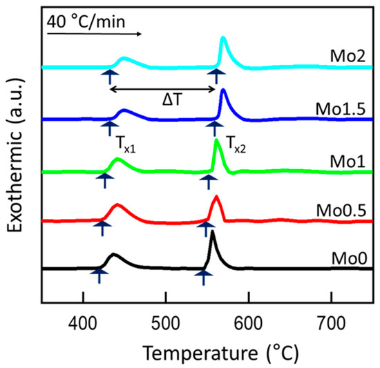 The effect of Mo addition in enhancing thermal stability in the residual amorphous phase and promoting the formation of a fine nanocrystalline structure during the crystallization is also verified by DSC analysis on Fe82−xSi4B12Nb1MoxCu1 (x = 0–2) ribbons (Figure 5). The analysis revealed two exothermic peaks corresponding to Tx1 (α-Fe(Si)) and Tx2 (Fe-metalloid compounds) [59]. The crystallization temperatures (Tx) and the temperature interval () are summarized in Table 4. As the Mo content increases, both Tx1 and the Tx2 rise, indicating that Mo enhances the thermal stability of the amorphous matrix and improves GFA [60]. Mo delays Fe-metalloid compounds and promotes the growth of α-Fe(Si) nanocrystals, ensuring stability at higher temperatures during annealing. Furthermore, this results in a widening of the , providing more favorable annealing conditions for nanocrystal formation. A wider crystallization window provides sufficient time for the formation of fine, uniform nanocrystals [49].