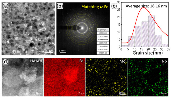 Figure 7a presents a high-resolution STEM image, confirming that nanocrystals with sizes around 20 nm are uniformly distributed. This microstructure is ideal for Fe-based nanocrystalline alloys and significantly enhances soft magnetic properties [17,63].