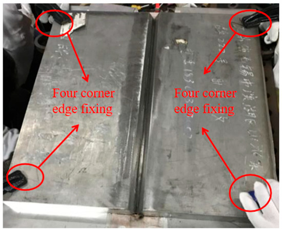 The butt-welded thick plate under investigation was fabricated by joining two Ti80 thick plates (500 mm × 250 mm × 42 mm) using gas-shielded manual arc welding with double-sided alternating welding. The width of the surface weld bead was 25 mm, and it featured a double-V groove configuration with 32 weld passes. The post-weld dimensions measured 500 mm × 500 mm × 42 mm. The distribution of Ti80 butt weld thick plate weld passes is shown in Figure 1. The dimensions of the Ti80 butt-welded thick plate are shown in Figure 2. During welding, the four corners were constrained as shown in Figure 3. The weld filler material was identical to the base metal. Welding shielding gas using 99.99% argon, gas flow rate of 25 L/min, welding speed of 20 mm/min constant, with the welding parameters set at 25 A current and 125 V voltage. The initial welding temperature was maintained at 25 °C. The inter layer temperature of the weld pass is 100 °C or less.