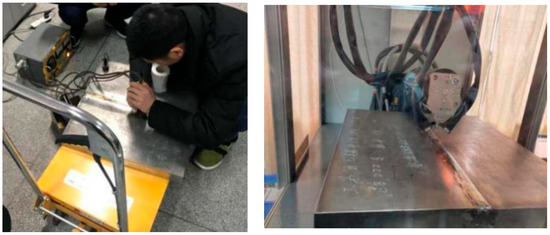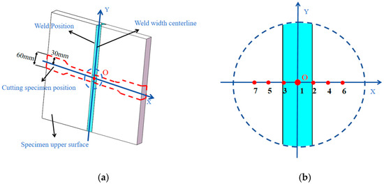 Harmful welding residual stresses inevitably occur during the welding process. These stresses seriously threaten the service life of the structure. Measurement methods for residual stresses can be generally categorised into destructive and non-destructive testing methods [25]. Non-destructive testing methods, including ultrasonic, X-ray and neutron diffraction methods, have the advantage of not damaging or affecting the performance of the tested parts [26], and are therefore widely used. Therefore, in this study, X-ray non-destructive testing was employed to experimentally investigate the welding residual stress in the fabricated Ti80 butt-welded thick plate before wire-cut electric discharge machining (Figure 4). The surface containing the final weld pass of the Ti80 butt-welded thick plate was defined as its upper surface (Figure 5). The residual stress measuring equipment adopts the X-ray non-destructive testing system (Canadian Residual Stress Testing and Analysis System LXRD MG2000, Proto Co., Ltd., Ottawa, ON, Canada). Residual stress measurements are carried out using X-ray related standards and procedures [27]. The geometric centre of the upper surface was designated as origin O, with the X-axis perpendicular to the weld line through origin O and the Y-axis aligned along the centreline of the weld width, as shown in Figure 5.