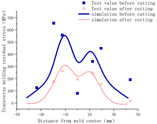 Test and simulation results of transverse welding residual stress (X-axis) before and after cutting.