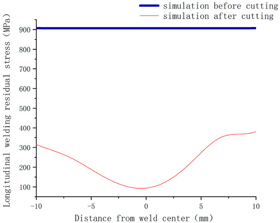 Simulation results of longitudinal welding residual stress (Y-axis) before and after cutting.