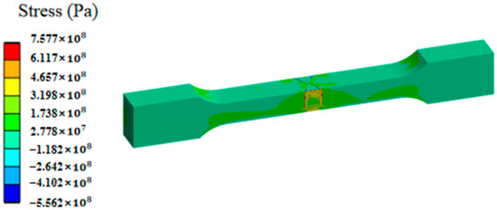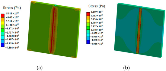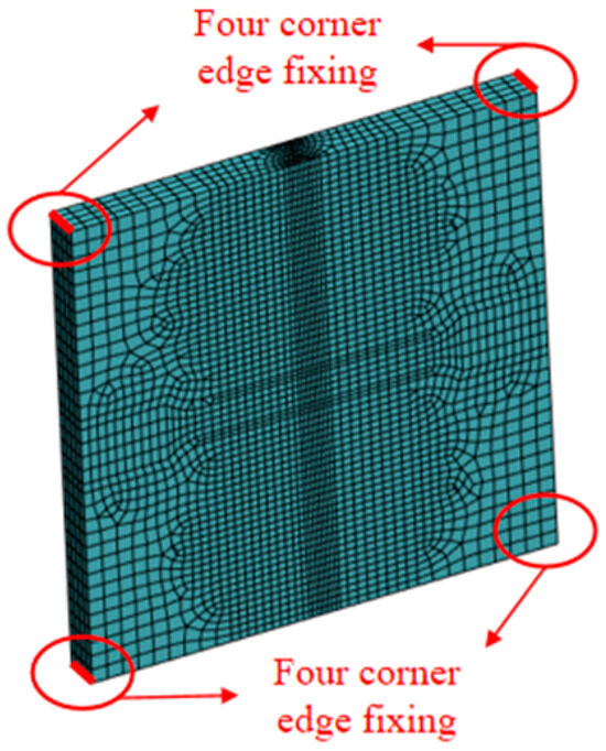 A finite element model was established for the Ti80 butt-welded thick plate (Figure 2). The mesh was refined in the weld zone and adjacent regions, and coarser mesh divisions were applied to the areas distant from the weld and cutting paths to ensure computational accuracy [28]. The size of the unit at the weld and the cutting seam is 3 mm, the size of the unit in the transition section near the weld seam is 10 mm, and the size of the unit at the farthest end of the weld seam is 15 mm. The total number of structural units is 27,000. The four corners of the plate were constrained (Figure 3), as shown in Figure 8. Residual stress before welding thick plate cutting is shown in Figure 9