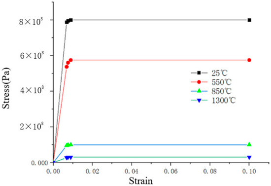 Under the influence of high-temperature loading, the material undergoes plastic deformation [23,24]. The stress–strain relationship can be expressed as
