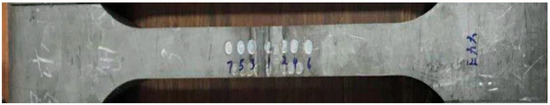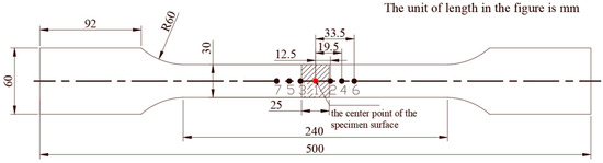 To conduct subsequent mechanical property tests, such as tensile testing, the Ti80 butt-welded thick plate (Figure 8) was cut to form tensile specimens with specific dimensions, as shown in Figure 11. Specific dimensions of cut specimens as shown in Figure 12. The thermal cutting process uses wire-cut electric discharge machining with a cutting speed of 10 mm/min. After cutting, X-ray non-destructive testing was performed on the transverse welding residual stresses at surface measurement points 1–7 (Table 1 and Figure 12). The test results are presented in Table 1 and Figure 6.