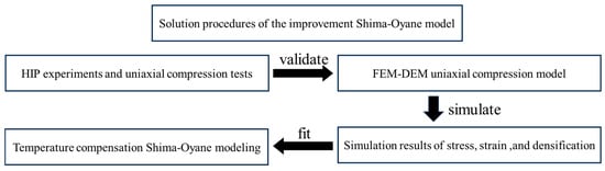 Hot isostatic pressing (HIP) is an advanced materials-processing technology. It consolidates powders at high temperatures and pressures to produce fully dense, near-net-shape components. Due to its ability to manufacture isotropic components with excellent mechanical properties, HIP is widely utilized in critical aerospace, biomedical, and energy industries [,,]. However, the component performance is governed by the complex interplay of thermos–mechanical phenomena, including time–temperature–pressure dependencies, viscoplasticity deformation, and diffusion-driven pore closure [,]. These multiscale, interdependent mechanisms occur nonlinearly across varying stages of densification, complicating predictive modeling and optimization. Therefore, different constitutive equations are used to simulate the flow behavior and densification mechanisms of metal powders during HIP process, such as the power-law creep equation [,], Drucker-Prager model [], the Can-Clay model [], the Perzyna model [,], and the Shima–Oyane model [,]. It is worth noting that, although the Shima–Oyane model does not account for key mechanisms in HIP such as diffusional creep, grain boundary diffusion, and pore surface tension effects, it has nonetheless become a widely adopted approach for modeling densification, owing to its broad applicability across a wide density range and its compatibility with various alloy systems. Wang et al. [] established a HIP densification map using the Shima–Oyane model. Liu’s group [] utilized the Perzyna model to investigate titanium alloy compacts’ high-temperature plasticity and creep coupling behavior. Although the Shima–Oyane model is applied to most materials and provides highly accurate predictions across a wide density range, the stresses in these materials are temperature-dependent. Based on the subsequent simulation data and fitting results, it can be seen that the parameter f’ in the Shima–Oyane model exhibits an extremely strong temperature dependence. To accurately characterize the density evolution behavior of powders during HIP, the effect of the temperature on the yielding model parameters must be considered.