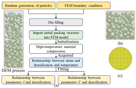 The powder particle size used in HIP is on the micrometer scale. Therefore, a smaller numerical model is employed, with sufficiently small grid divisions to ensure the accuracy of the simulation results. Initially, a particle-scale finite element geometric model is constructed in the DEM. The powder material is simplified as spherical, with particle sizes ranging from 20 to 100 μm. The actual particle size distribution of the material is also considered, with the powder diameter following a normal distribution. Figure 3 shows the flow chart of the coupled thermos–mechanical mesoscopic numerical simulation of the powder HIP process, where each particle is assigned an independent mesh and treated as a distinct individual for calculation. The simulation was conducted at temperatures ranging from 700 °C to 1100 °C under an applied axial pressure of 120 MPa. The inter-particle friction coefficient was set to 0.2.