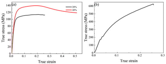 Stress–strain curves of samples with a densification of 0.980 at different temperatures: (a) 1100 °C; (b) 800 °C.